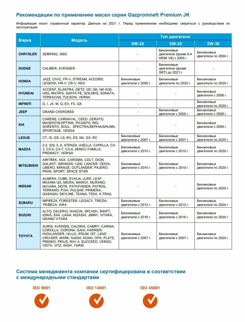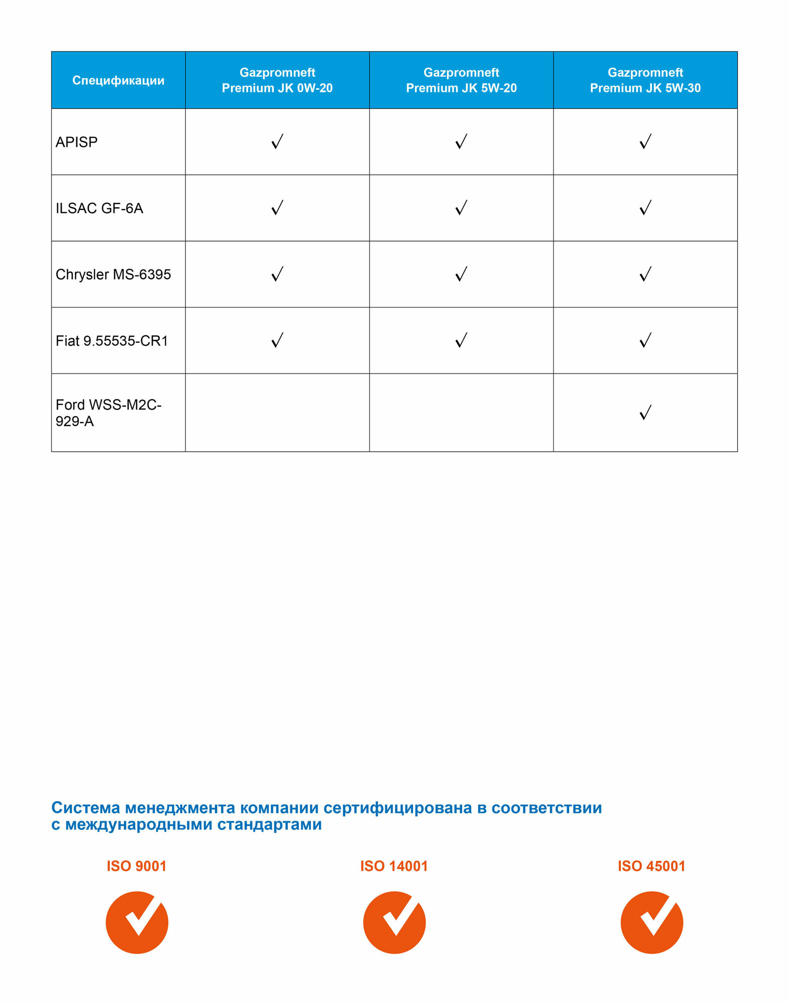 Gazpromneft Premium JK 5w30 1л. SP синт. мотор. масло ILSAC GF-6A; Fiat 9.55535-CR1; Ford WSS-M2C-929-A; Chrysler MS-6395
