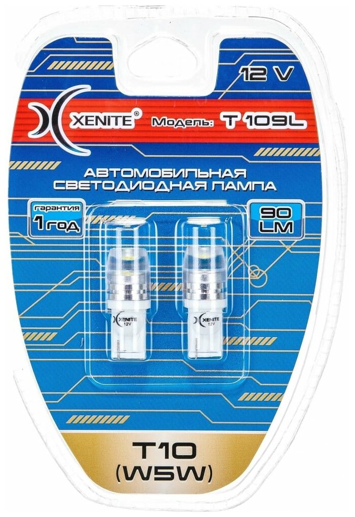 XENITE 1009273 лампа светодиодная 12v т10 w2.1x9.5d w5w t109l (яркость 90 lm) блистер 2 шт\