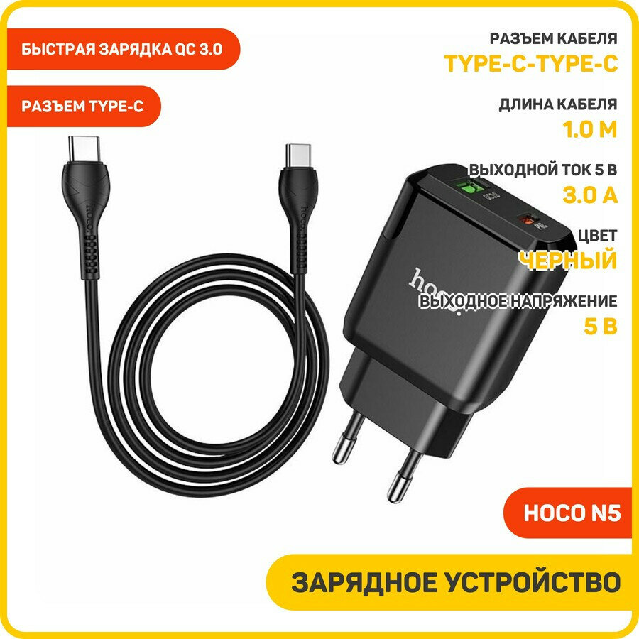 Купить Сетевое зарядное устройство (СЗУ) Hoco N5 (USB/Type-C) + кабель Type-C-Type-C, 3 А, черный