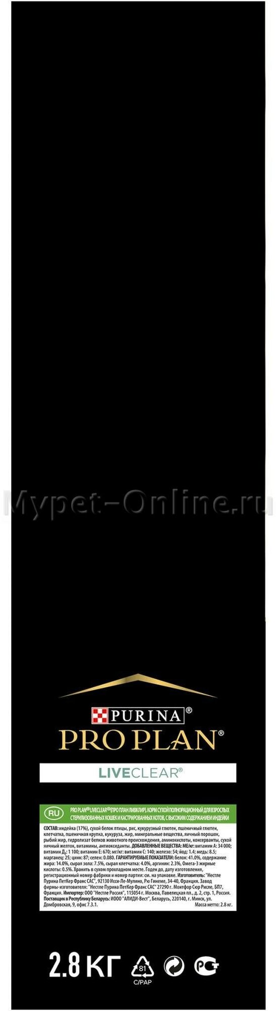 Pro Plan LiveСlear корм для стерилизованных взрослых кошек всех пород, индейка 2,8 кг