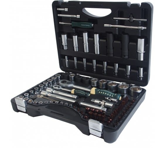 | Головки торцевые подробно | торцевые 6-ти гранные 1/4" длиной 25 мм: 4, 4.5, 5, 5.5, 6, 7, 8, 9, 10, 11, 12, 13, 14 мм; торцевые 6-ти гранные 1/4" длиной 50 мм: 6, 7, 8, 9, 10, 11, 12, 13 мм; головки-биты 1/4" длиной 35 мм: H3, H4, H5, H6, T8, T10, T15, T20, T25, T27, T30, SL4, SL 5.5, SL6, РН1, РН2, PZ1, PZ2; головки торцевые 6-ти гранные 1/2" длиной 38 мм: 10, 11, 12, 13, 14, 15, 16, 17, 18, 19, 20, 21, 22, 24, 27, 30, 32 мм (усиленные 17, 19, 21 мм); головки торцевые 6-ти гранные 1/2" длиной 77 мм: 14, 15, 17, 19, 22 мм (усиленные 17, 19 мм); головки свечные 1/2": 16, 21 мм; трещотка 1/4" 48 зубов; удлинитель 1/4": 50, 100 мм; гибкий удлинитель 1/4": 100 мм; карданный шарнир 1/4"; адаптер 3/8"(F)х1/2"(M); удлинитель 1/2": 125, 250 мм; трещотка 1/2"; карданный шарнир 1/2"; битодержатель 1/2"(F)х5/16"(F) |
