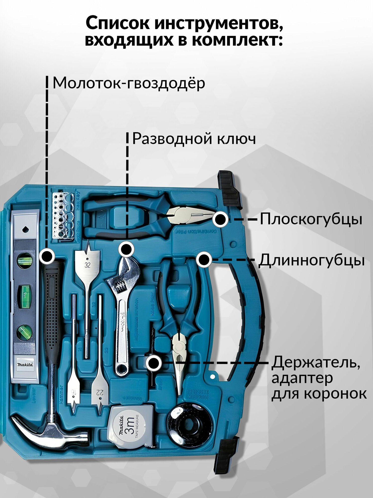 | Дополнительная информация | держатель для коронок, маска для отверстий, шестигранник, шаблон диаметров, рулетка: 3 м, |