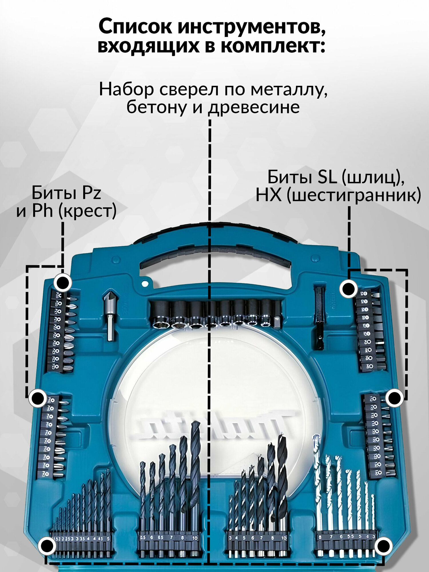 | Шлицы бит | Torx (T/TX) / крестообразный (PH) / крестообразный (PZ) / прямой (SL) / шестигранный (H/HEX) |