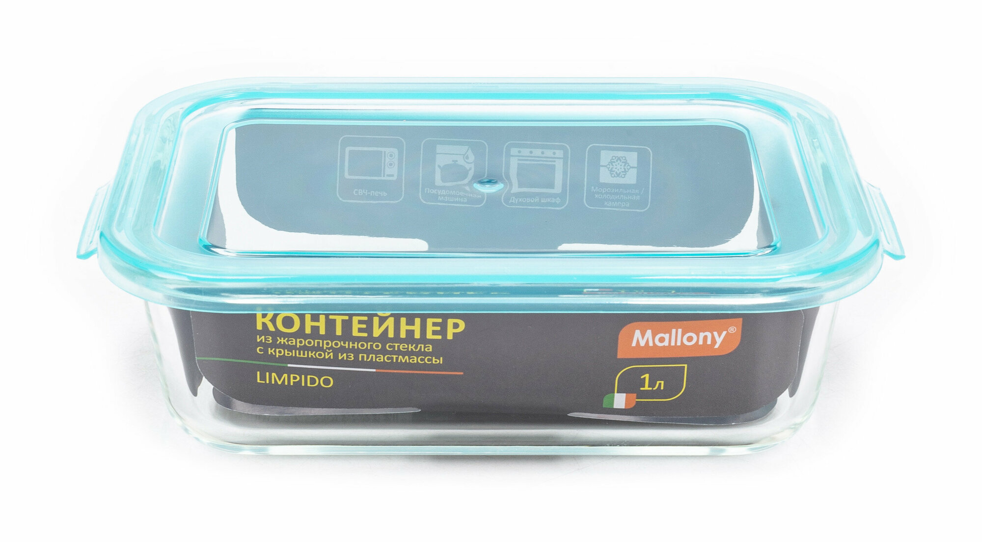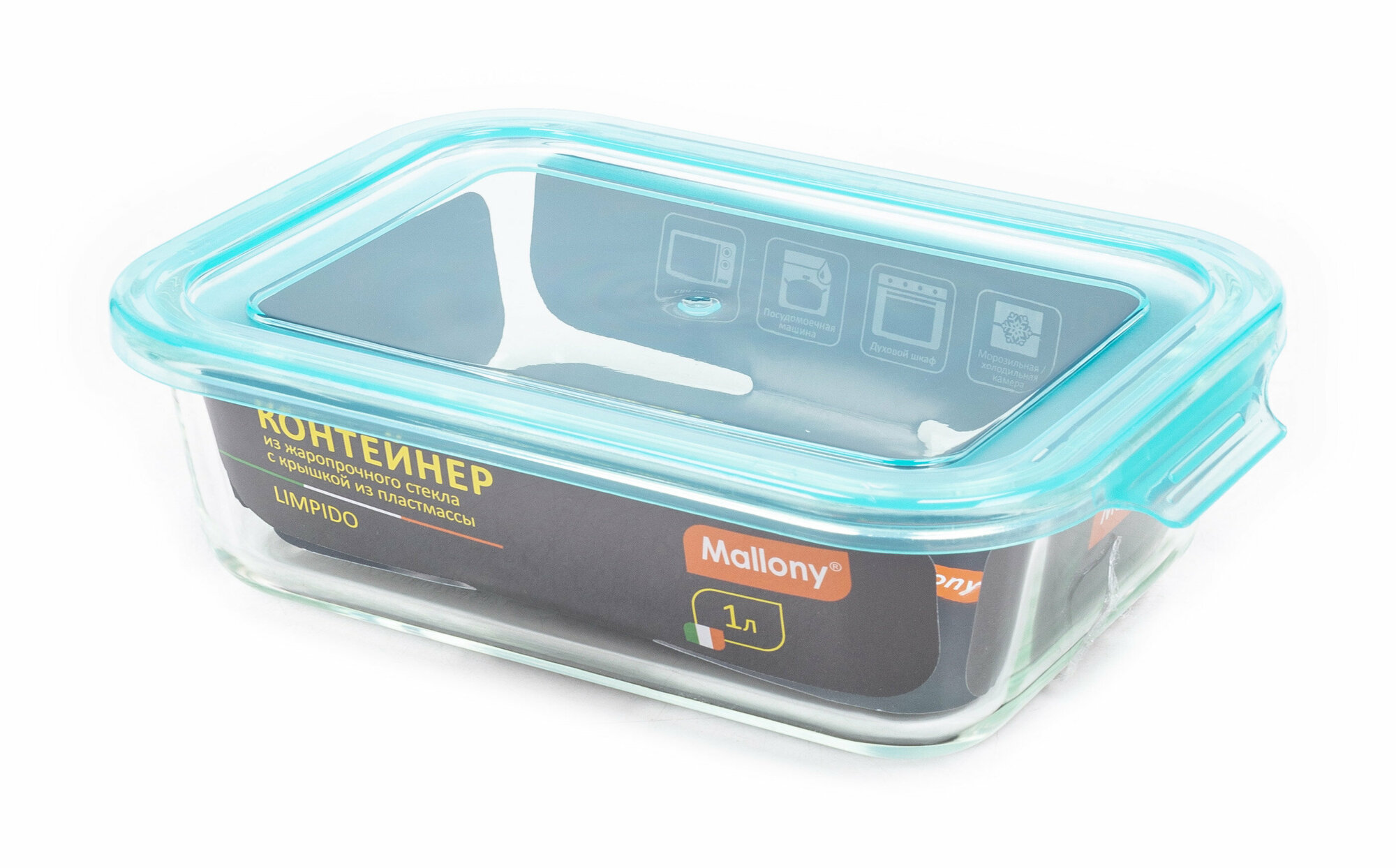 Контейнер Mallony Limpido 1000 мл из жаропрочного стекла с крышкой из пластмассы прямоугльный, темпе .