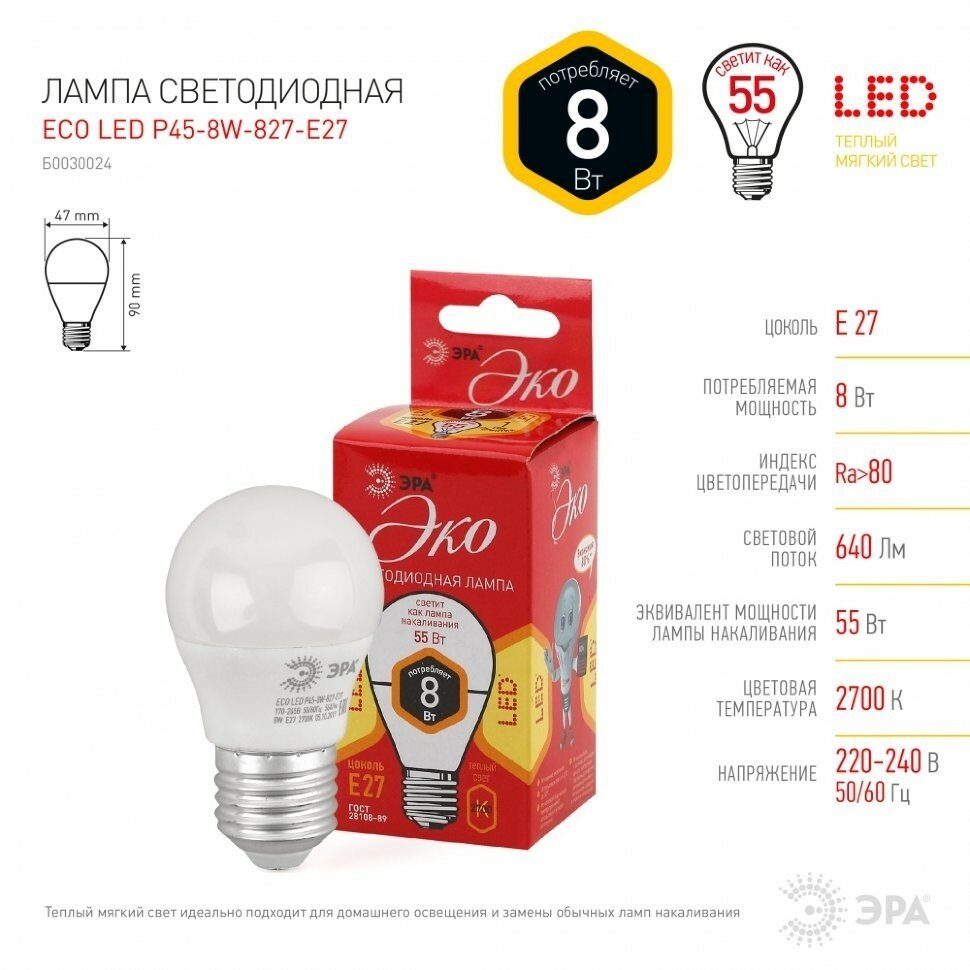 ЭРА ECO шар P45 E27 8W(640lm) 2700K 2K P45-8w-827-E27 3631