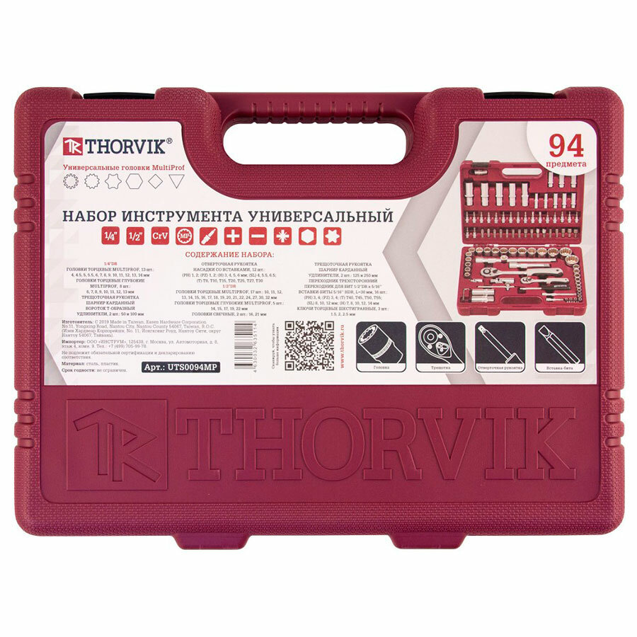 | Дополнительная информация | Набор инструмента универсальный 1/4", 1/2"DR с головками торцевыми 12-гранными, 94 предмета Thorvik |