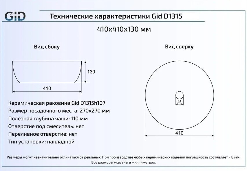 Накладная раковина белая 41.5x41.5x13.5см Gid D1315 интересное: