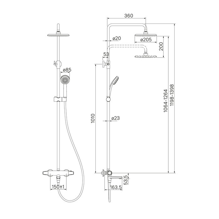 | Дополнительная информация | высота стойки для душа: 1398 мм; диаметр душевой лейки: 85 мм; диаметр верхнего душа: 205 мм |