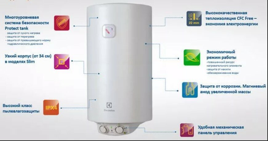 простое электронное управление, два независимых тэна, мощная защита в несколько уровней внутреннего бака
