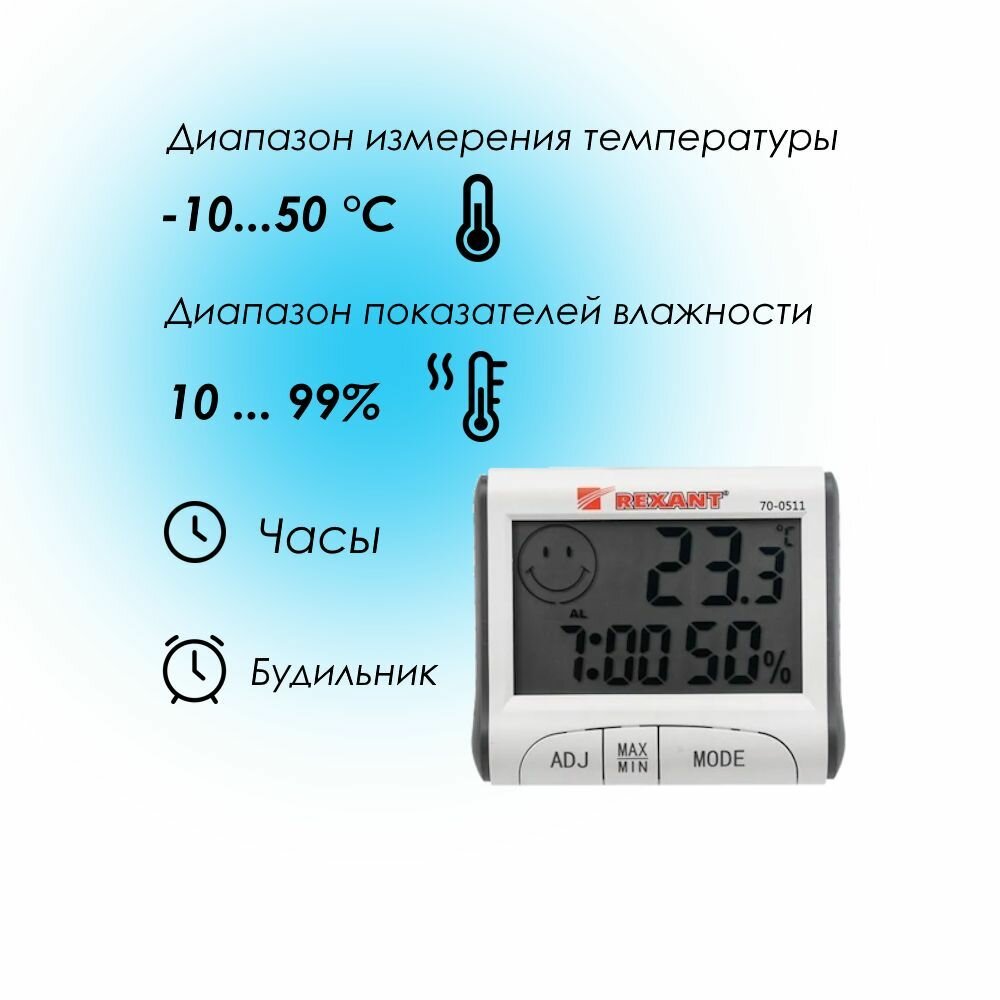 Термогигрометр REXANT комнатный с часами и функцией будильника