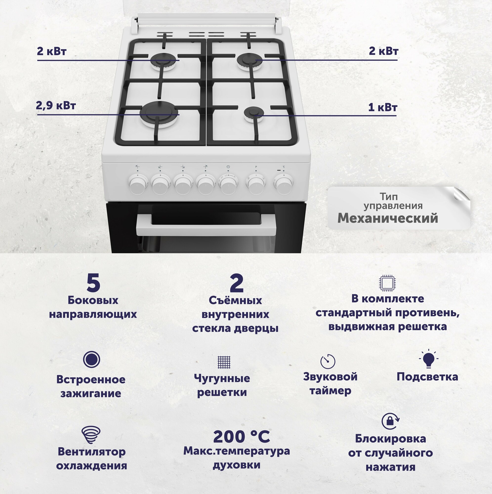 | Особенности конструкции | эмаль легкой чистки / ящик для посуды / подсветка духовки / воздушное охлаждение корпуса |