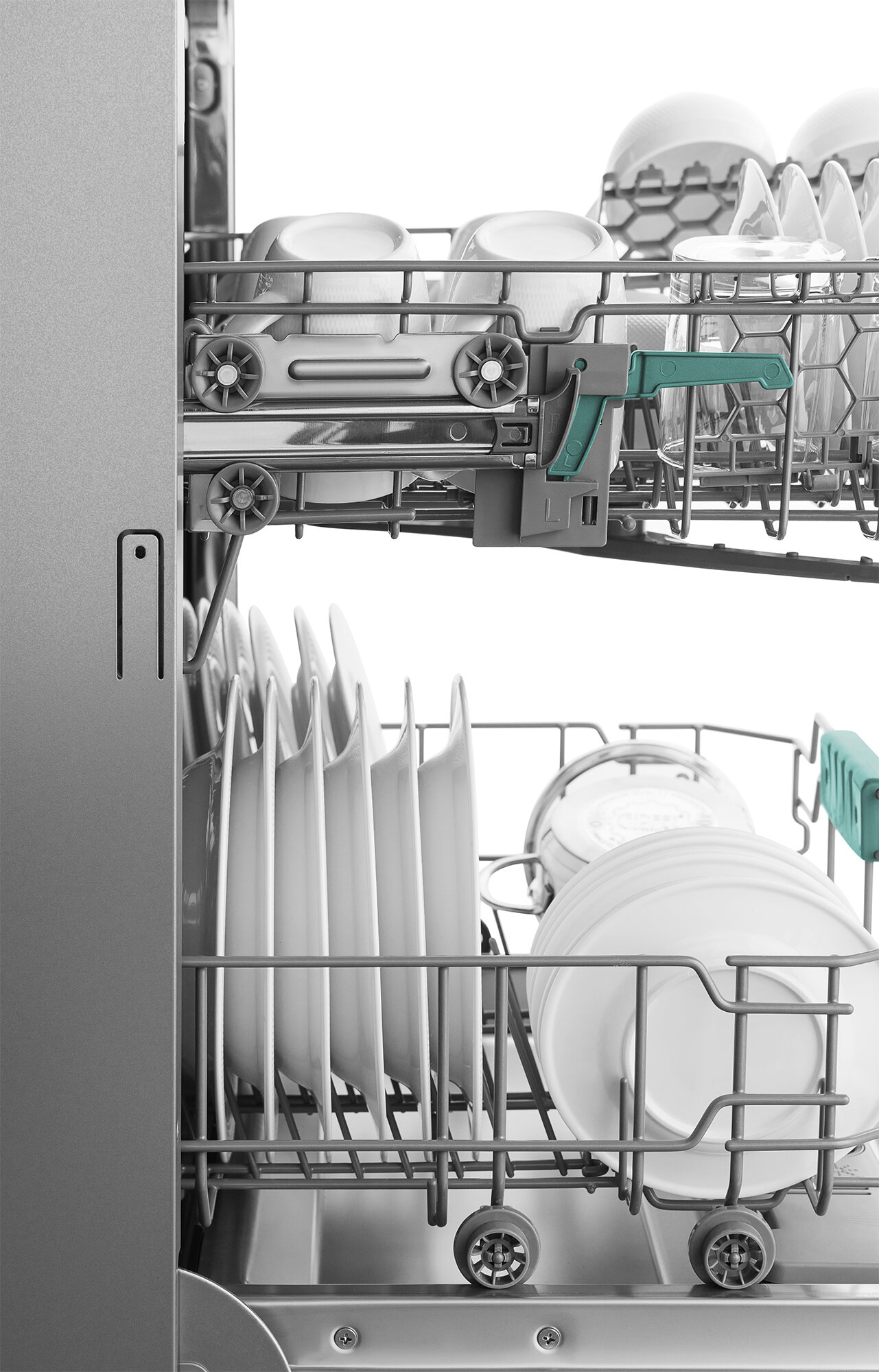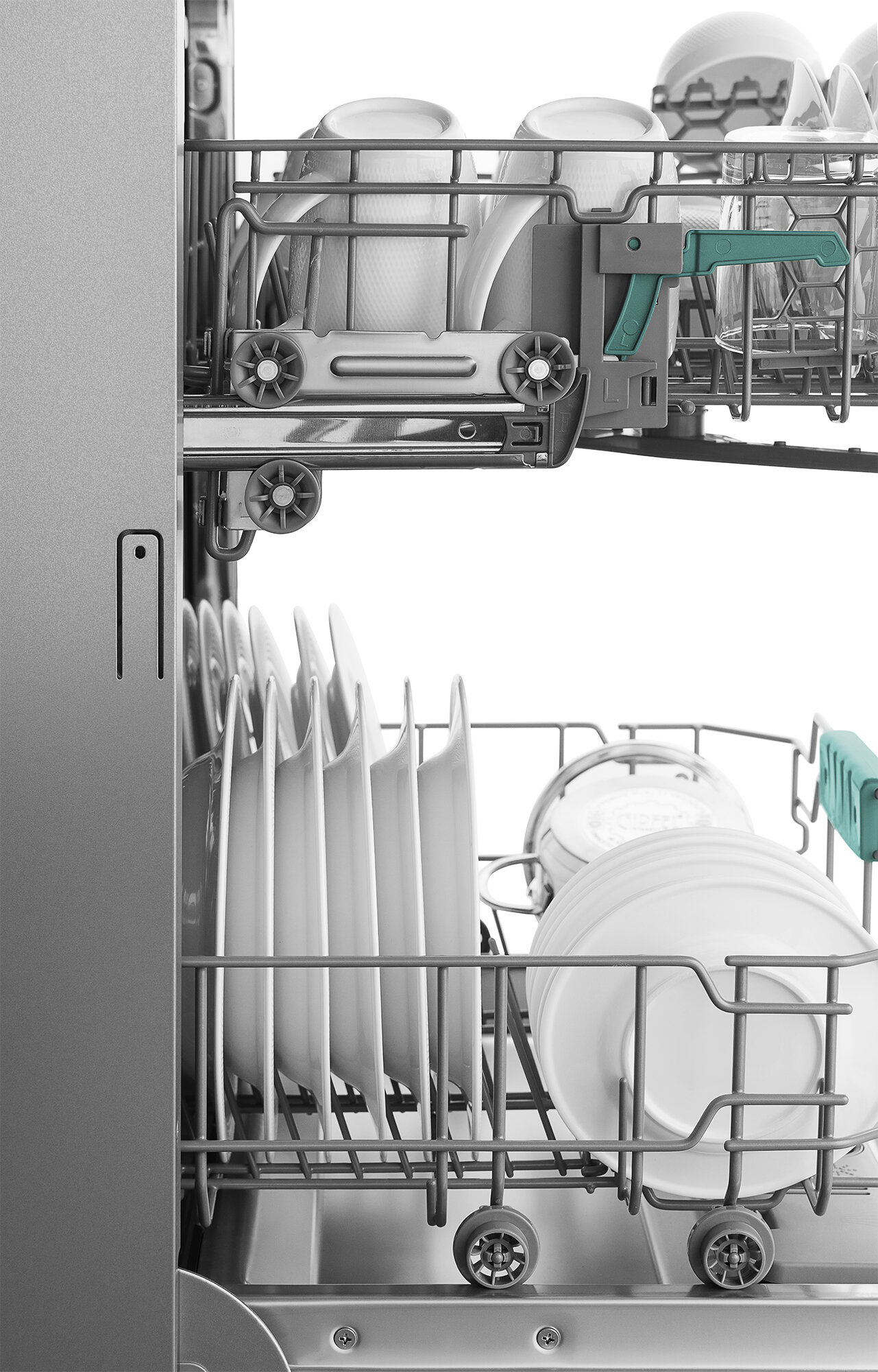 Вместительная, отдельный отсек для ложек/вилок, есть луч на полу, показывающий что мойка еще не закончилась. Шланг с защитой от протечек.