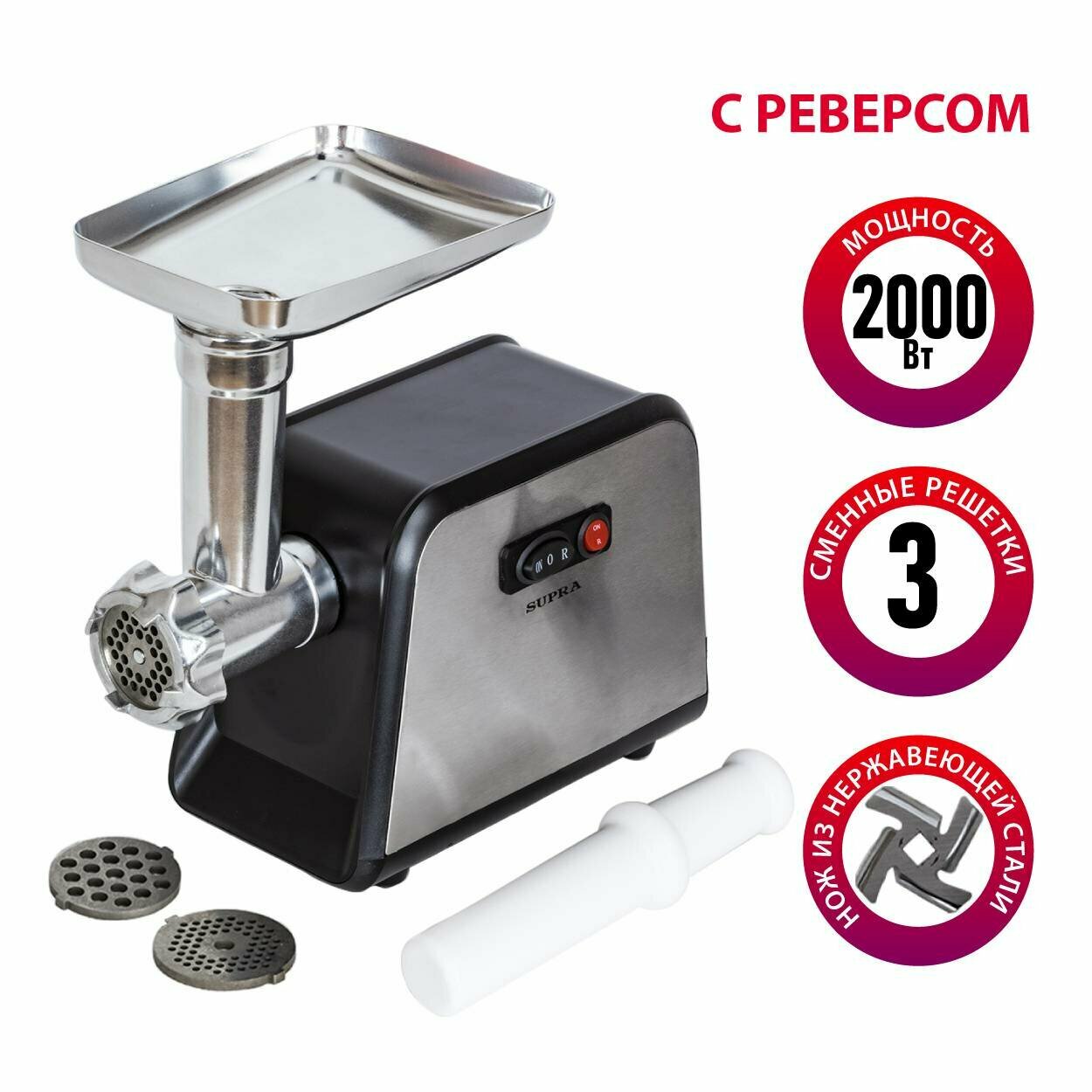 Мясорубка электрическая SUPRA с реверсом, 3 решетками 3 мм, 5 мм и 7 мм, 2000 Вт