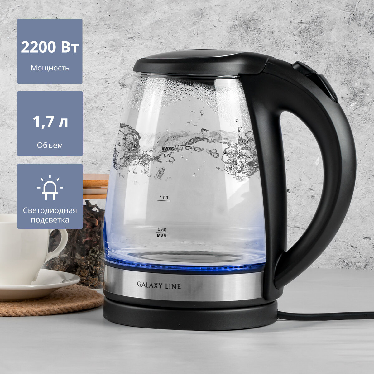 Электрический чайник GALAXY LINE GL 0560 с подсветкой и прозрачным корпусом, 2200Вт, объем 1,7 л, чёрный