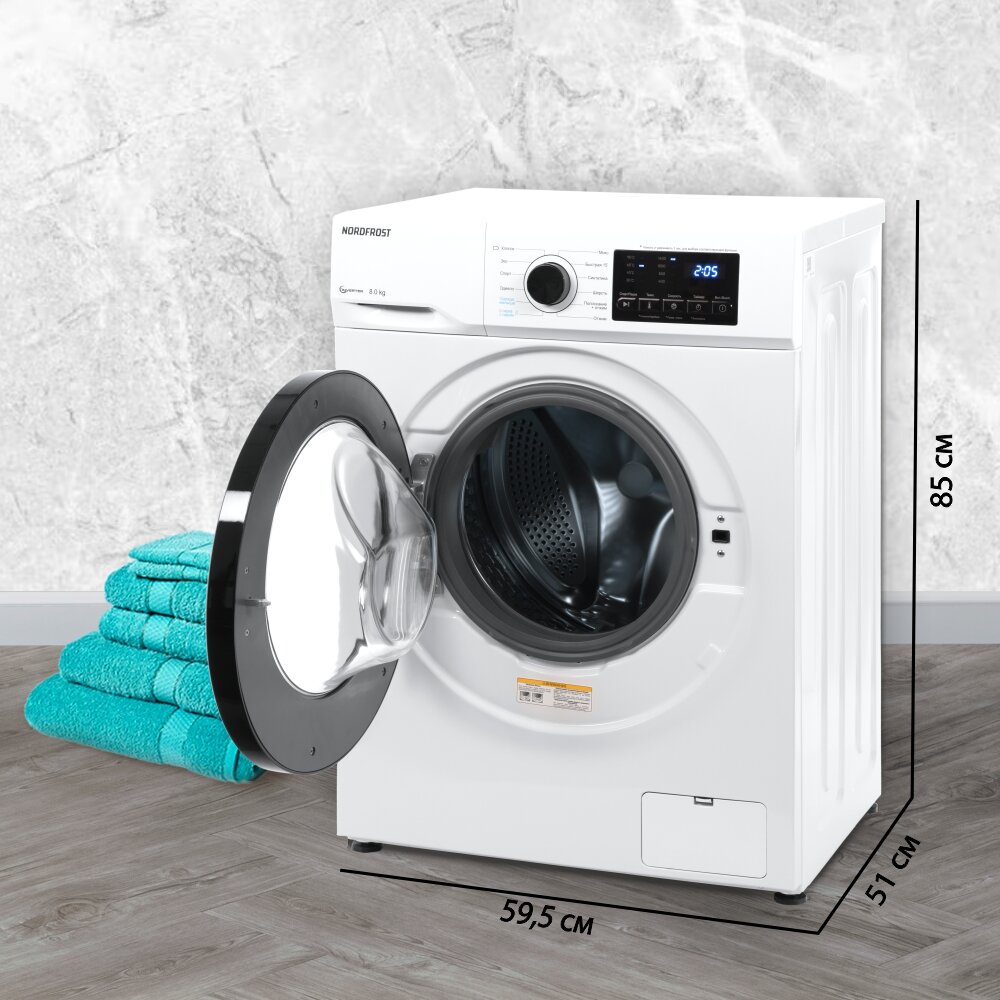 Стиральная машина NORDFROST i-WSQ4 8140 W, 8 кг загрузка, 60 л объем, 1400 об/мин, инверторный мотор,12 программ, цвет белый