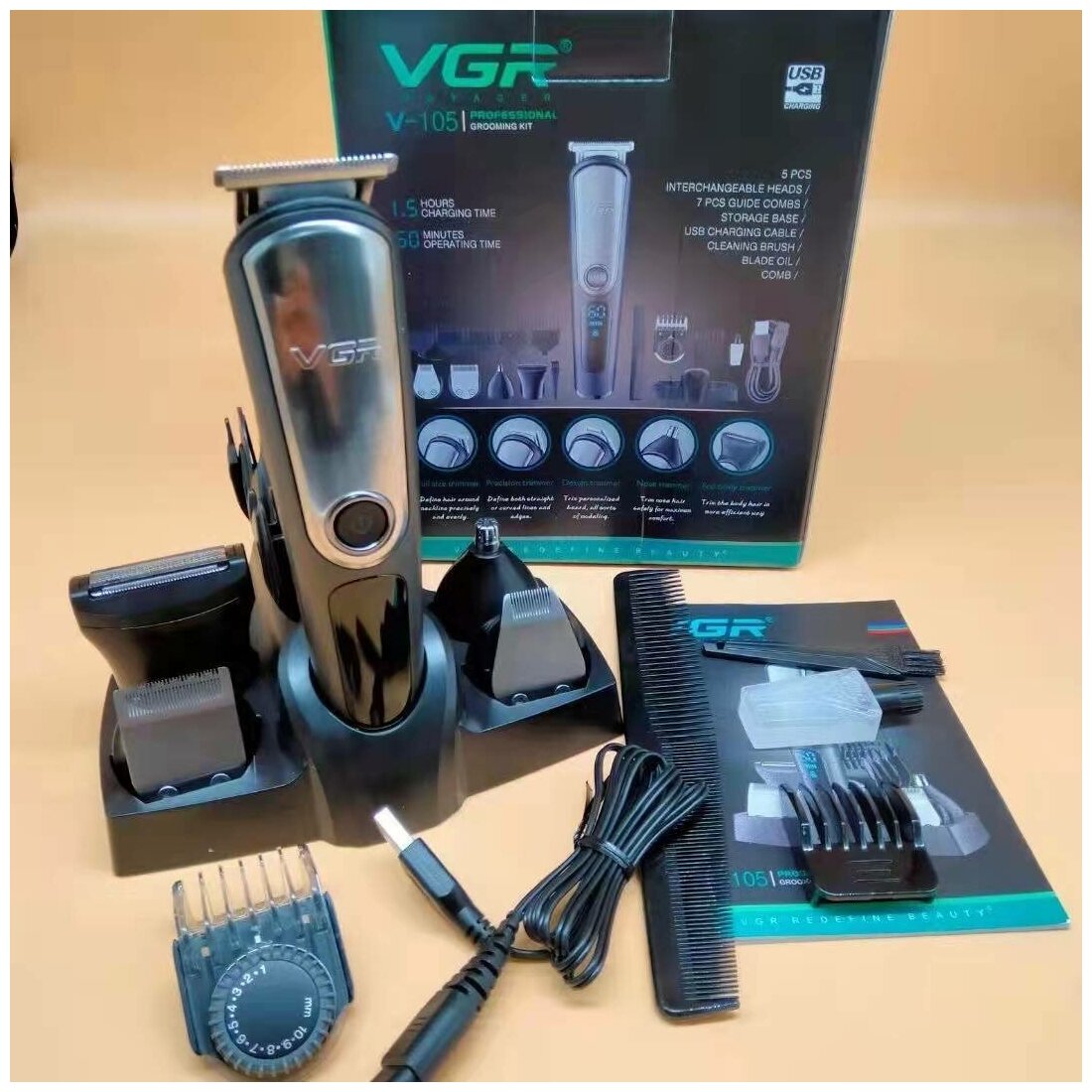 | В комплекте | щеточка / масло / масло 1 шт; щетка для очистки 1 шт; USB - кабель - 1 шт.; Гребневые насадки-5 шт; Узкий триммер 1 шт; Триммер для носа 1 шт; Дизайнерский триммер 1 шт; Насадка для стрижки волос 1 шт; Бритвенная головка 1 шт; База 1 шт |
