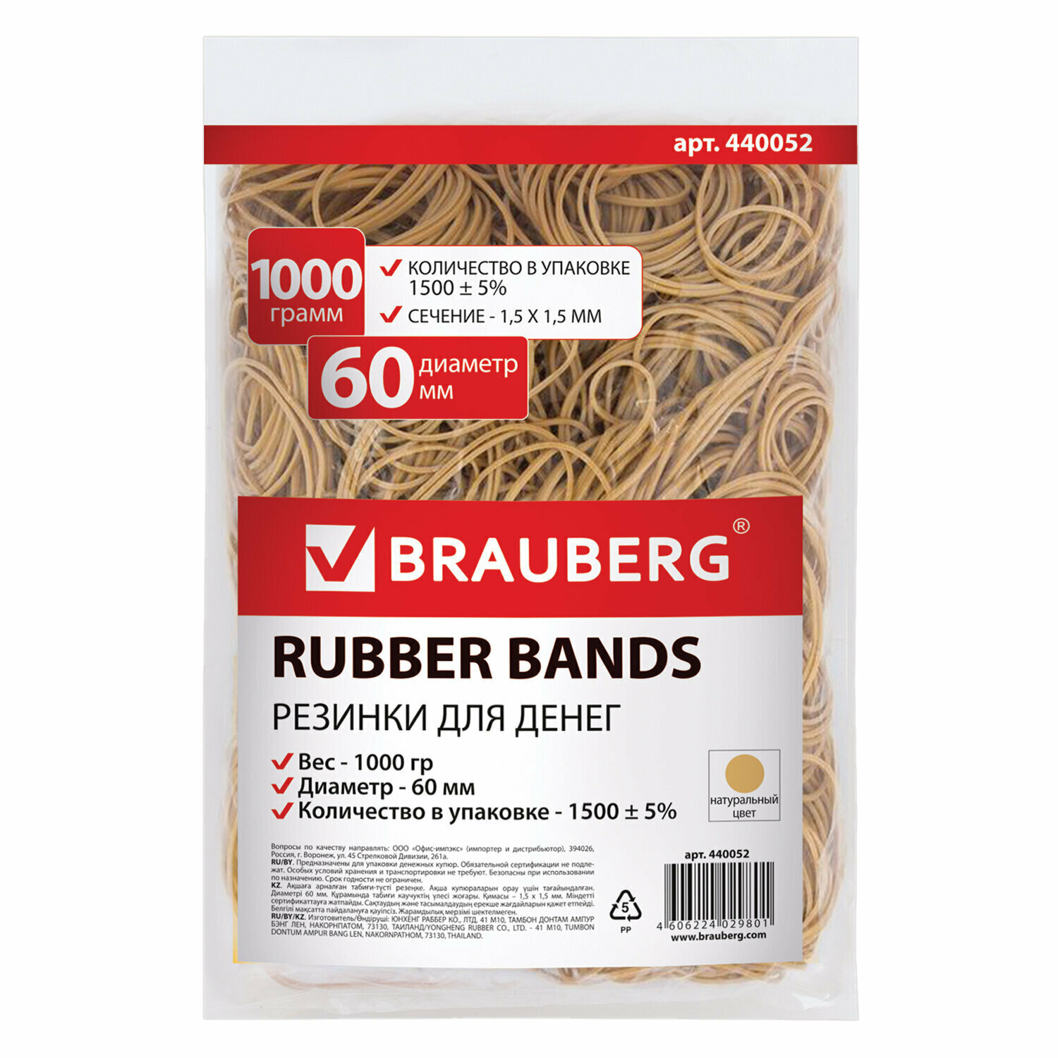 Резинки банковские универсальные диаметром 60 мм, BRAUBERG 1000 г, натуральный цвет, натуральный каучук, 440052, 440052