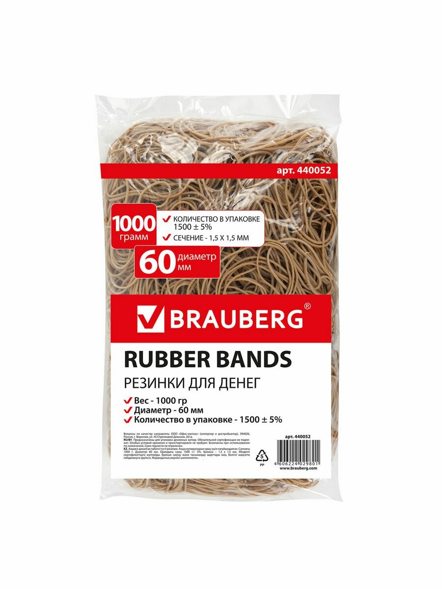 СохранитьРезинки банковские универсальные диаметром 60 мм, BRAUBERG 1000 г, натуральный цвет, натуральный каучук, 440052 - 1 шт. интересное: