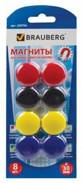 Магниты BRAUBERG, диаметр 30 мм, 5 шт., цвет ассорти, в блистере, 231729