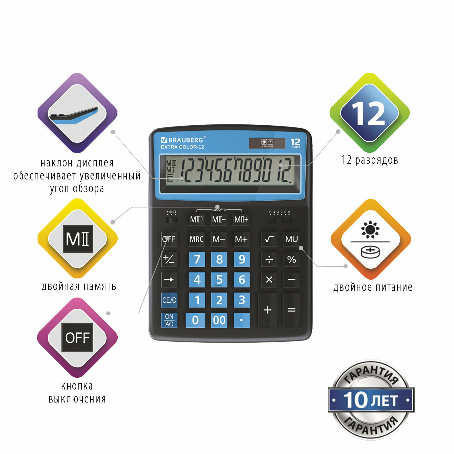 Калькулятор настольный BRAUBERG EXTRA COLOR-12-BKBU (206x155 мм), 12 разрядов, двойное питание, черно-голубой, 250476 В комплекте: 1шт.