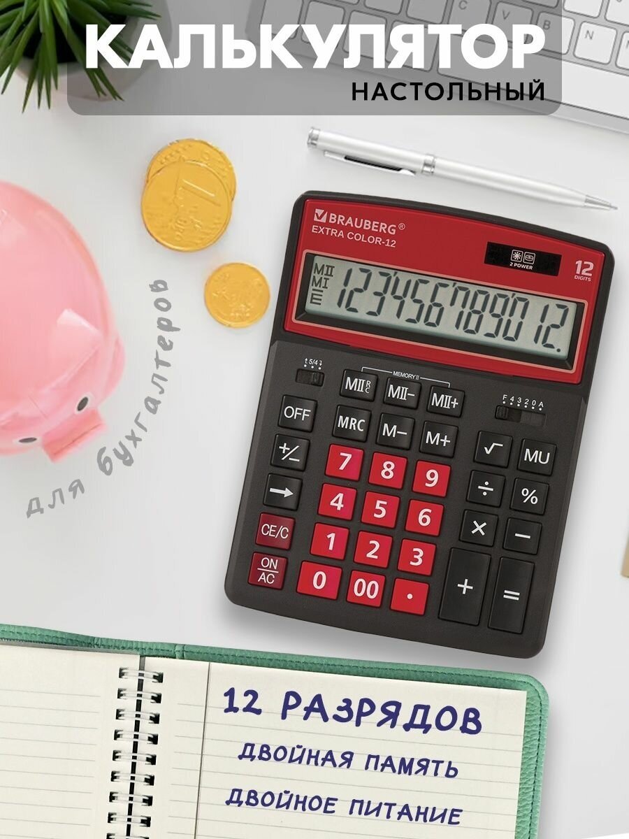 Калькулятор настольный BRAUBERG EXTRA COLOR-12-BKWR (206x155 мм), 12 разрядов, двойное питание, черно-малиновый, 250479, 250479
