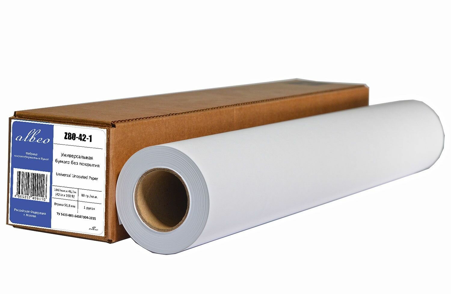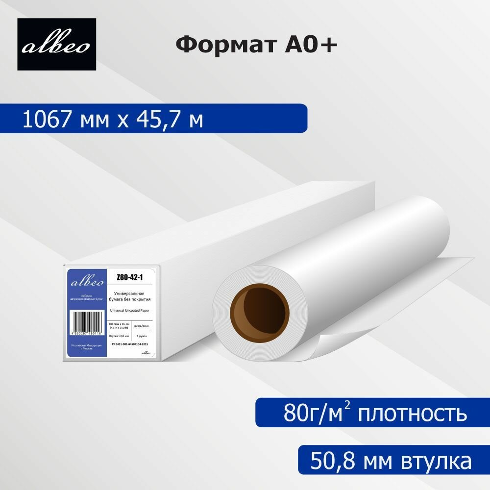 Бумага 1067мм 80г/м2 45.7м втулка 50,8мм Albeo Z80-42-1 Универсальная без покрытия