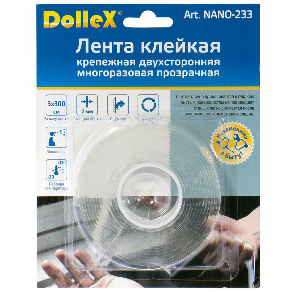 Лента Клейкая Крепежная Двухсторонняя Многоразовая Прозрачная 3 X 300 См DOLLEX арт. NANO-233