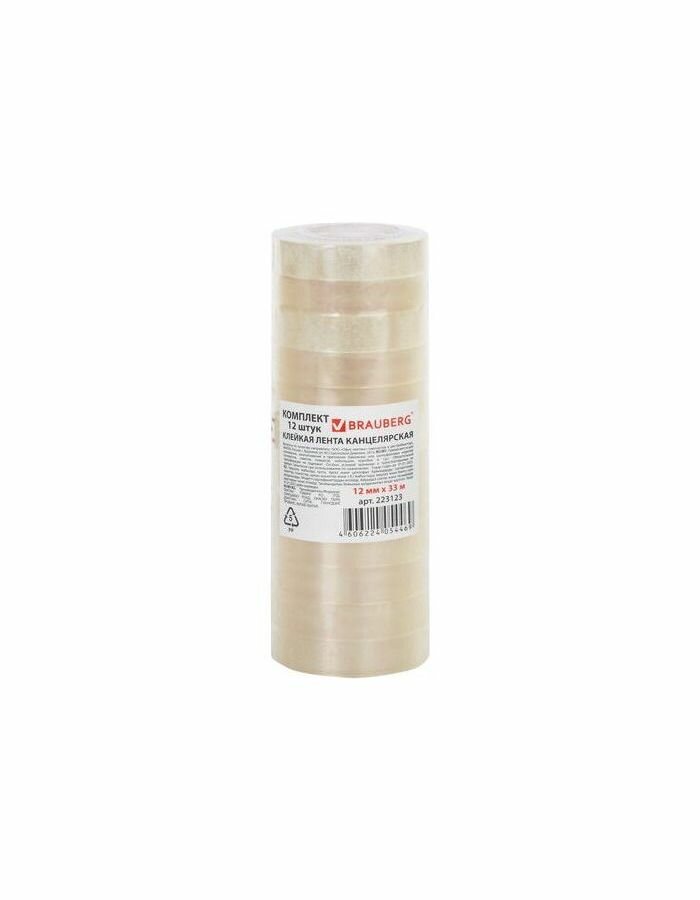 Клейкая лента канцелярская BRAUBERG 12 мм х 33 м канцелярские , комплект 12 шт., прозр., 223123