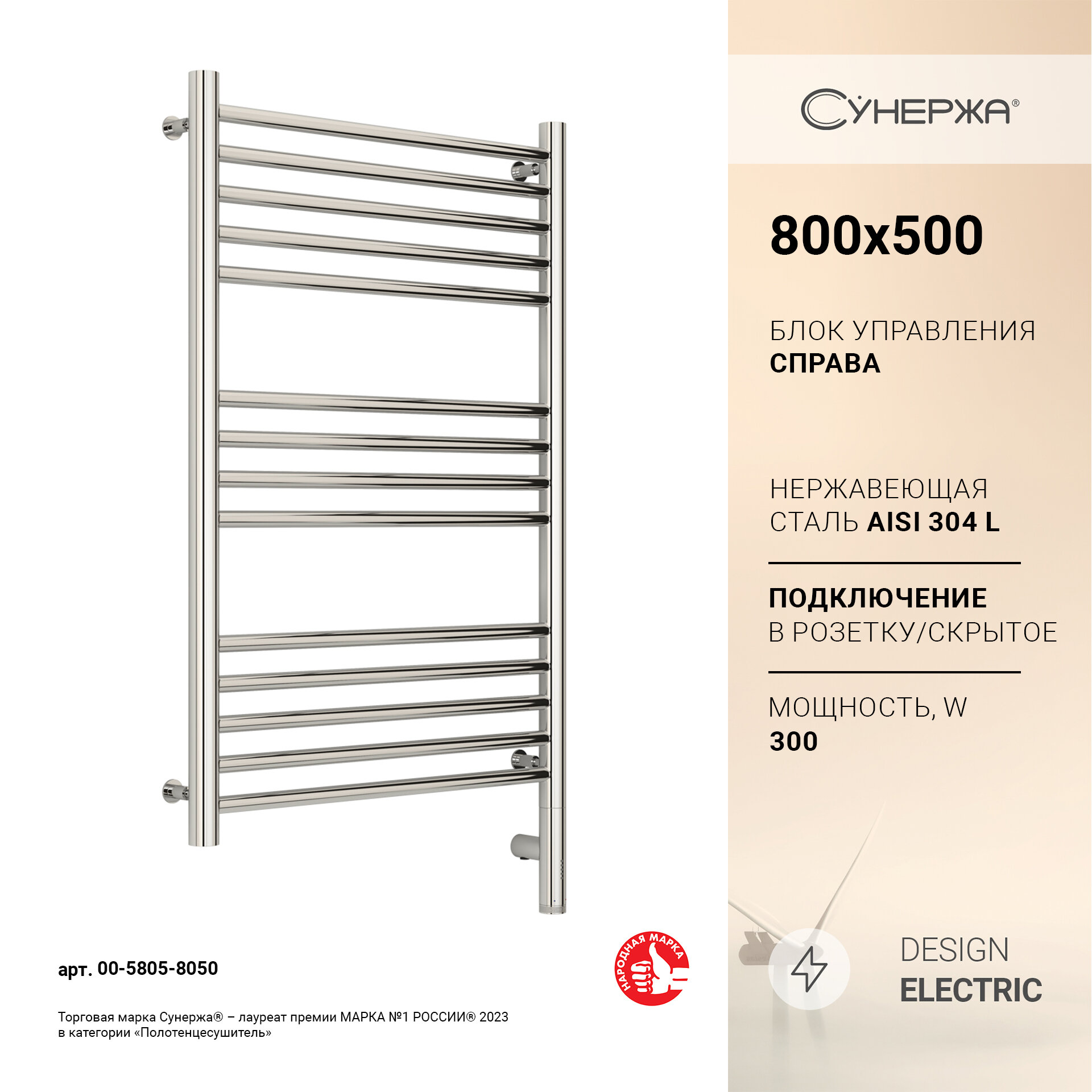 СУНЕРЖА Богема 3.0 прямая Полотенцесушитель 800х500 нерж.сталь, МЭМ правый 00-5805-8050
