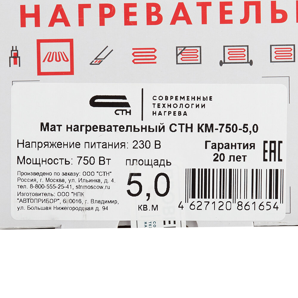 Нагревательный мат СТН Квадрат тепла КМ-750-5.0 150 Вт/м2 5 м2 750 Вт механический терморегулятор в подарок