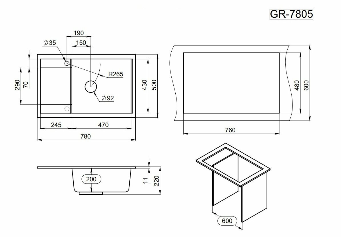 Кухонная мойка кварцевая Granula GR-7805 прямоугольная с крылом, врезная, чаша 480х440, цвет графит (7805bg)