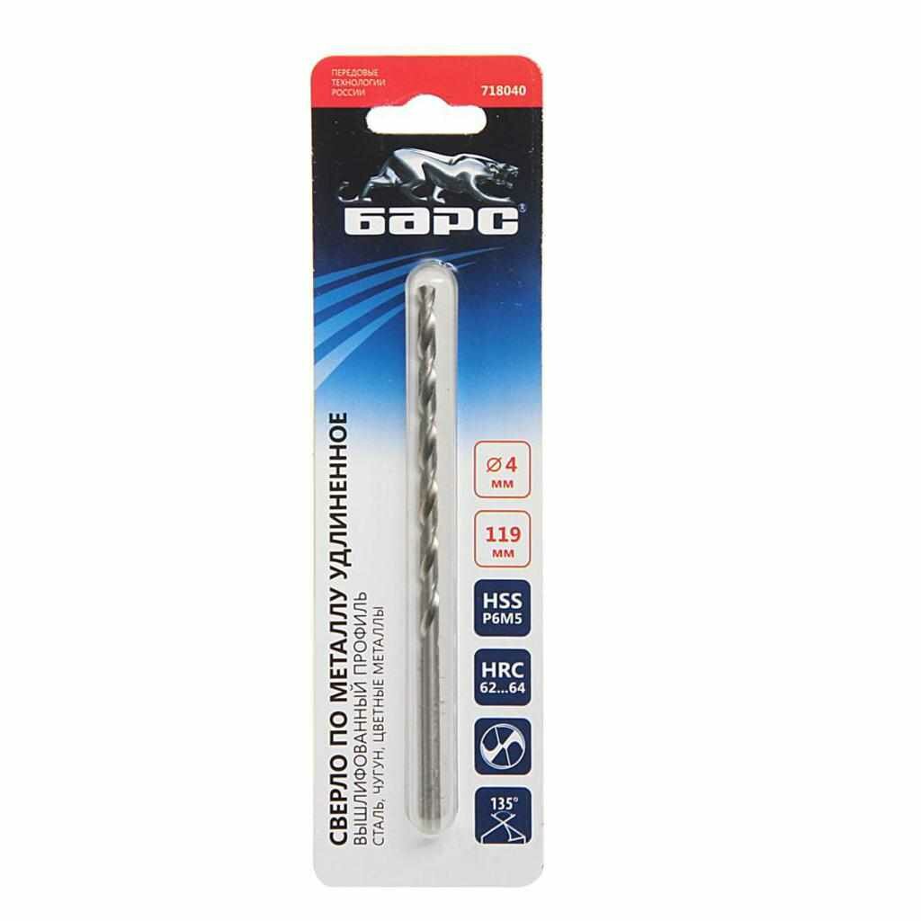 Сверло по металлу барс 718040, 4 x 119 мм, Р6М5, удлиненное
