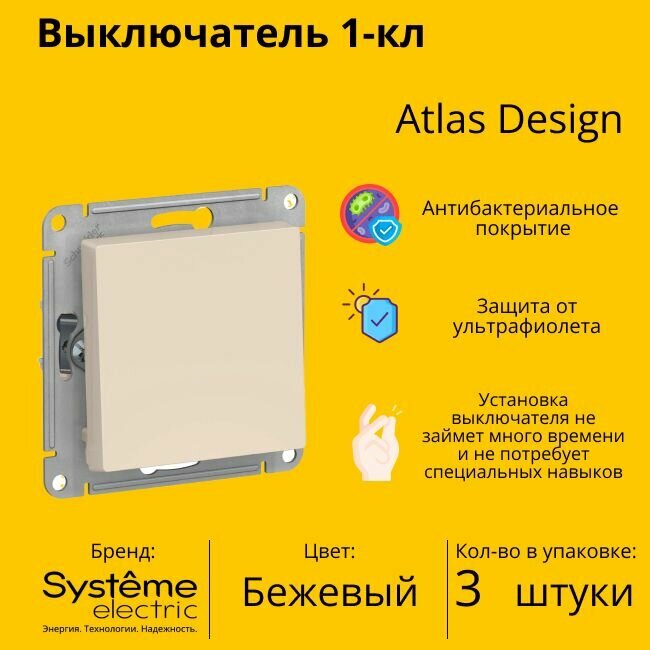 Купить Выключатель Systeme Electric Atlas Design 1-клавишный, ATN000211 Бежевый - 3 шт.