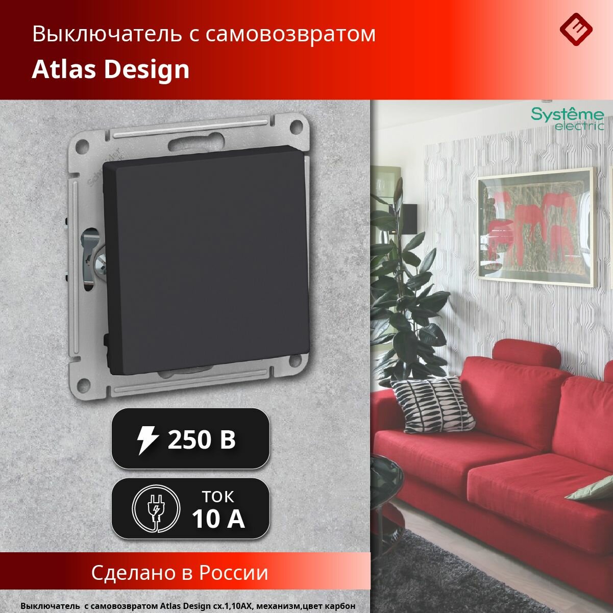 SE AtlasDesign Карбон Кнопка нажимная сх.1, 10АХ, механизм, Systeme Electric, арт. ATN001015