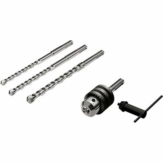 боковая рукоятка, ограничитель глубины сверления, ключевой патрон, набор буров по бетону (3шт), запасные щетки, кейс