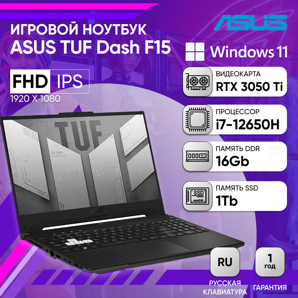 15.6" Ноутбук ASUS TUF Dash F15 FX517ZM-AS73 Intel Core i7 12650H, RAM 16 ГБ, SSD 512, RTX 3060
