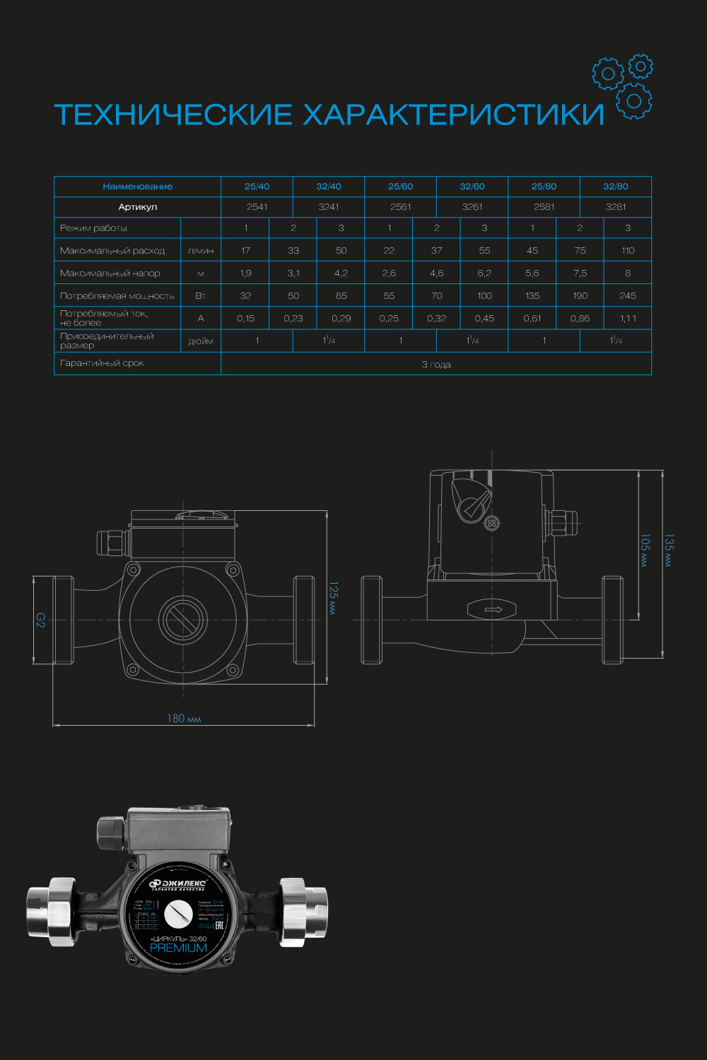 Насос циркуляционный Джилекс Циркуль Premium 32/80, 135/190/245 Вт