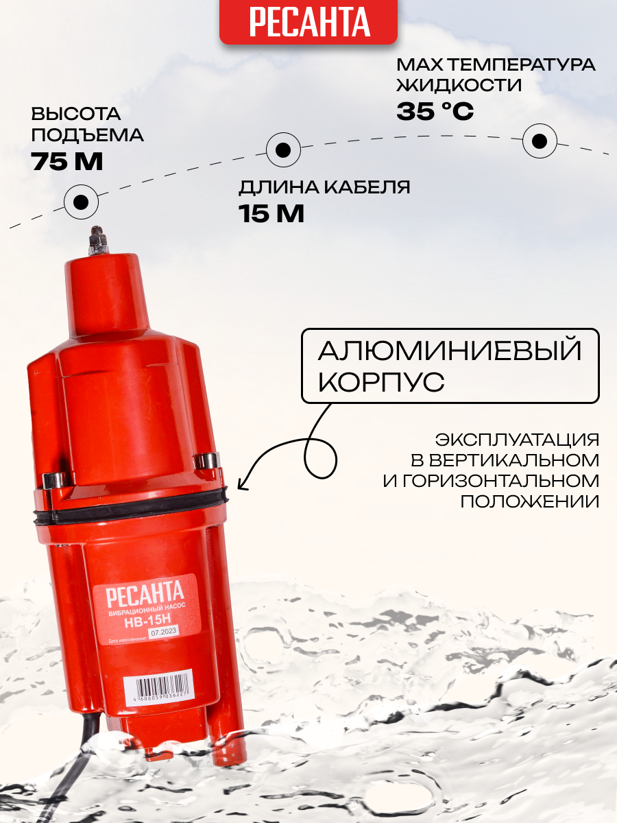 | Дополнительная информация | Преимущества Ресанта НВ-15Н Корпус из алюминеевого сплава; Высота подъема воды - 72 м; Мобильный и универсальный в применении; Эксплуатация в вертикальном и горизонтальном положении; Удобно погружать и поднимать насос благодаря наличию шнура. |