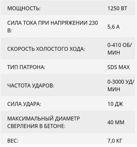 | Комплектация | Перфоратор Пыльник Смазка (50г) Пика Зубило Буры SDS PLUS - 3шт: *16 мм *18 мм *22 мм Кейс Инструкция |