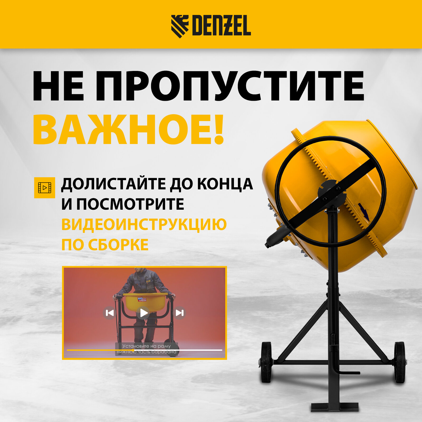 Бетономешалка DENZEL, B-160, 160 л, 700 Вт, чугунный венец и стальная втулка, кнопка экстренного выключения, регулировка наклона барабана, II класс защиты, защита от перегрева и коррозии, IP44, 95422