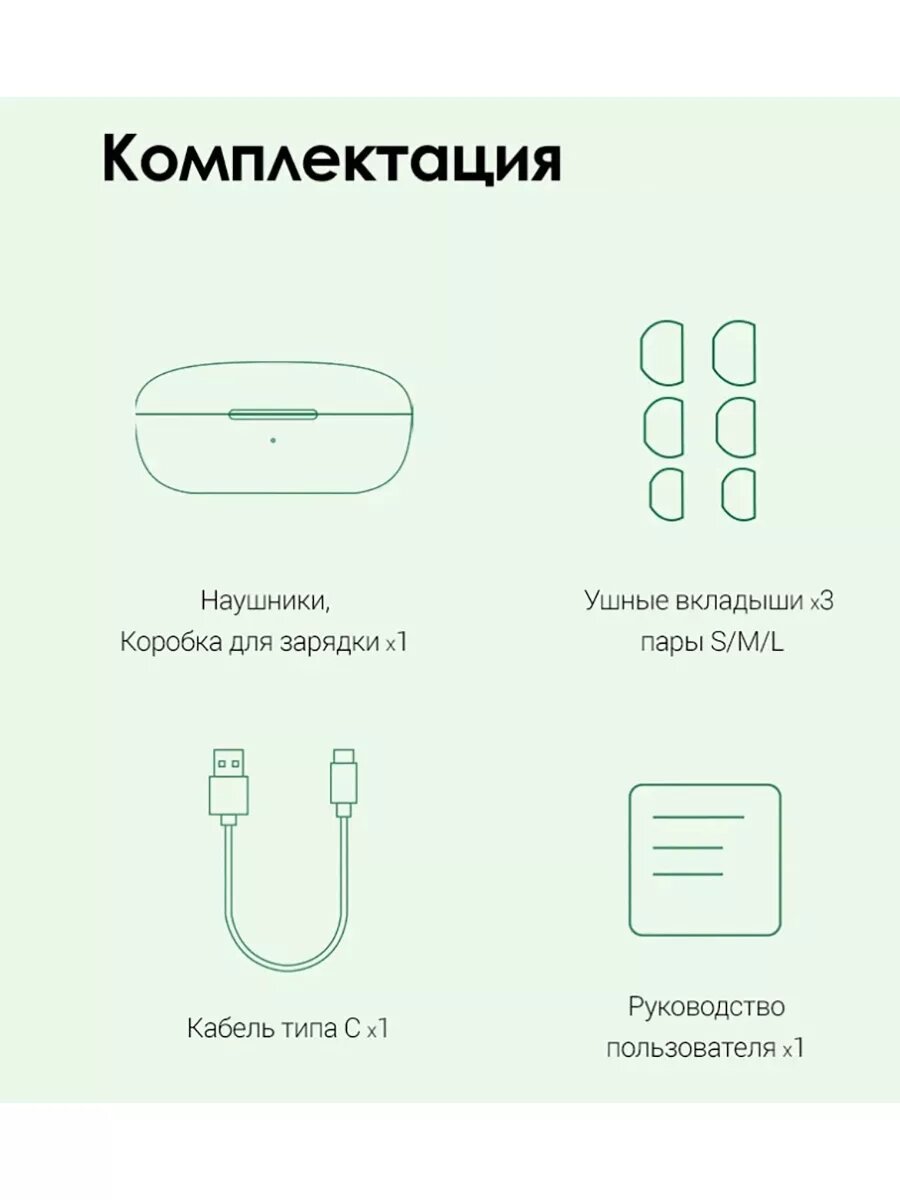 | Комплектация | наушники, кейс для зарядки, кабель для зарядки, 3 пары сменных амбушюр, руководство пользователя |