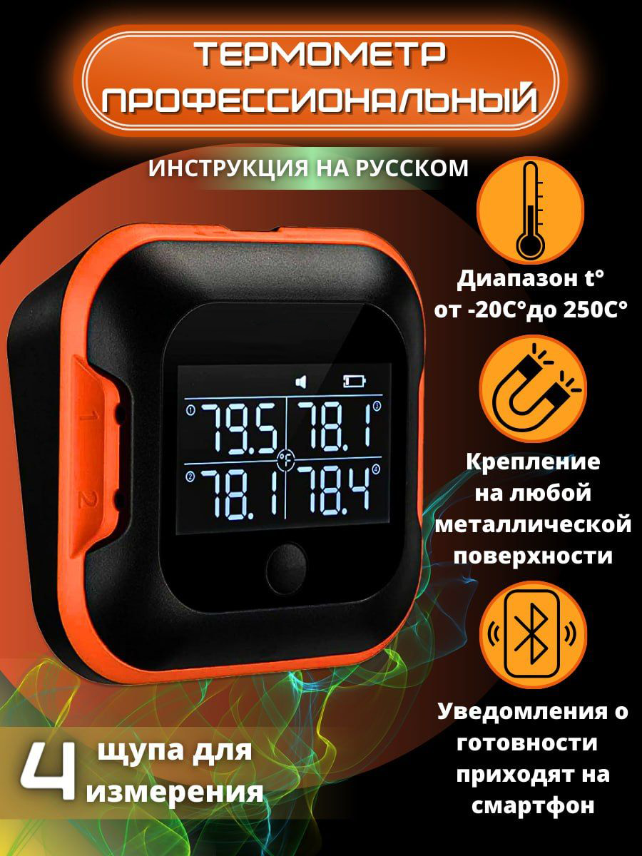 Термометр Prime Grill IBT-24S, пластик, с 4 щупами, Bluetooth, оранжевый
