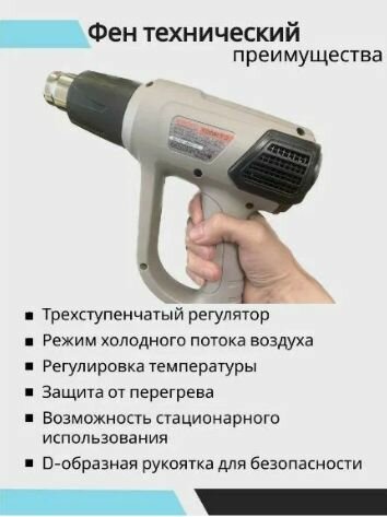 | Дополнительная информация | 3 режима работы - 50 °C, 350 л/мин; 50-600 °C, 350 л/мин; 50-600 °C, 500 л/мин |