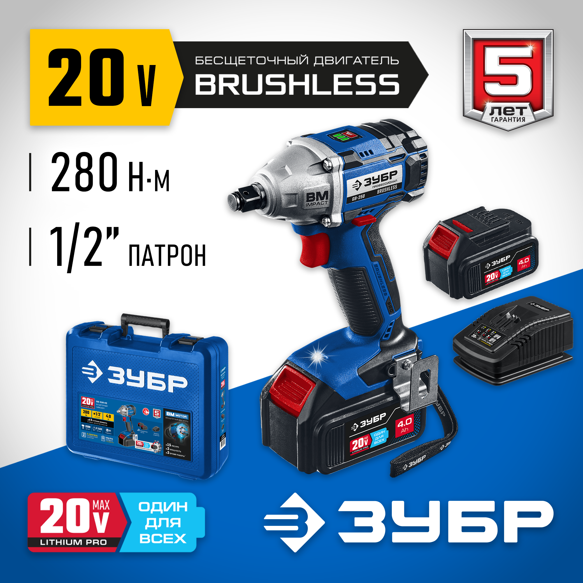 Гайковерт Зубр 20В бесщеточный, 2 АКБ (4Ач), в кейсе, Профессионал. GB-250-42