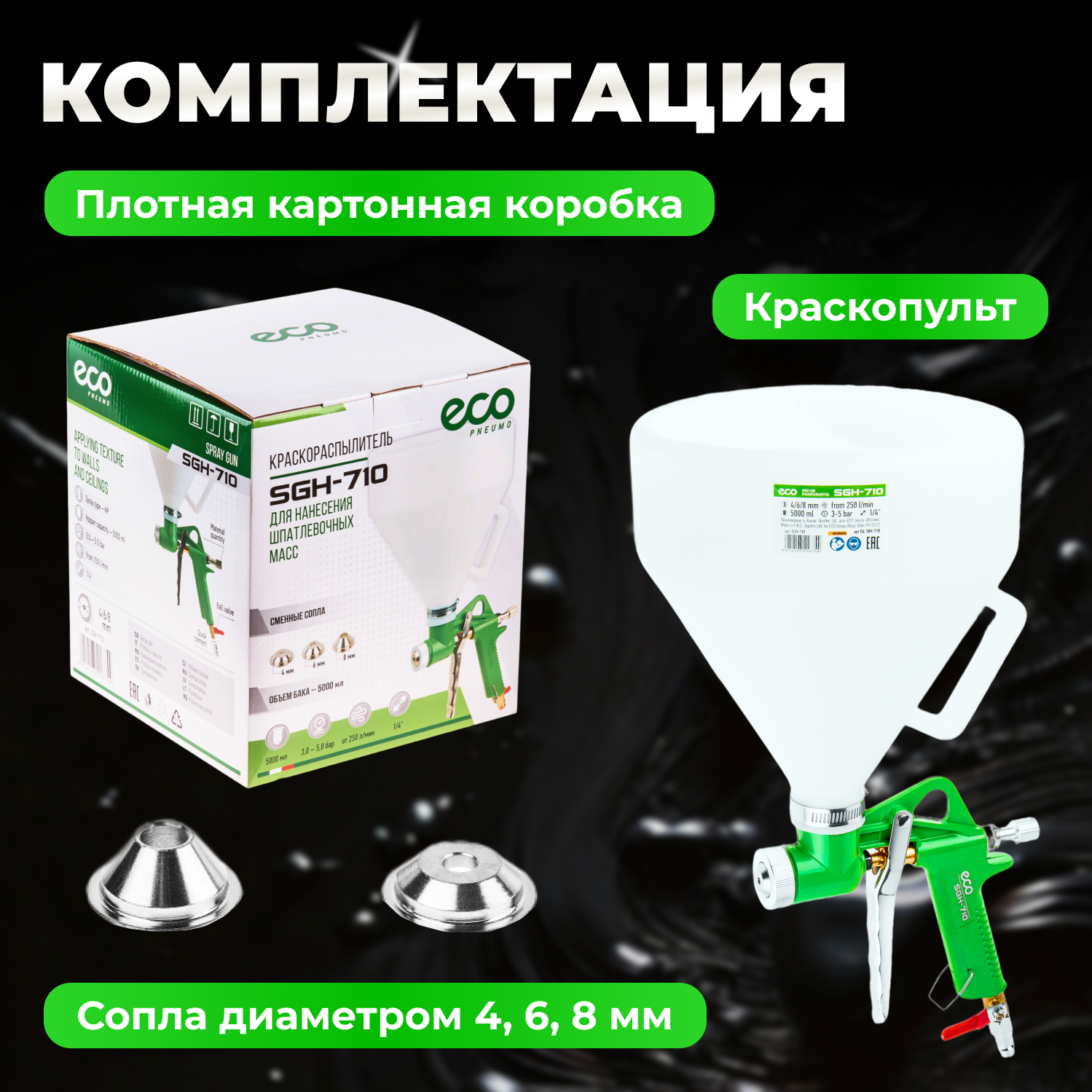 Краскораспылитель Eco SGH-710 (HP, сопло ф 4, 6, 8 мм, вернхий бак 5000 мл), для нанесения штукатурки, и шпатлевки