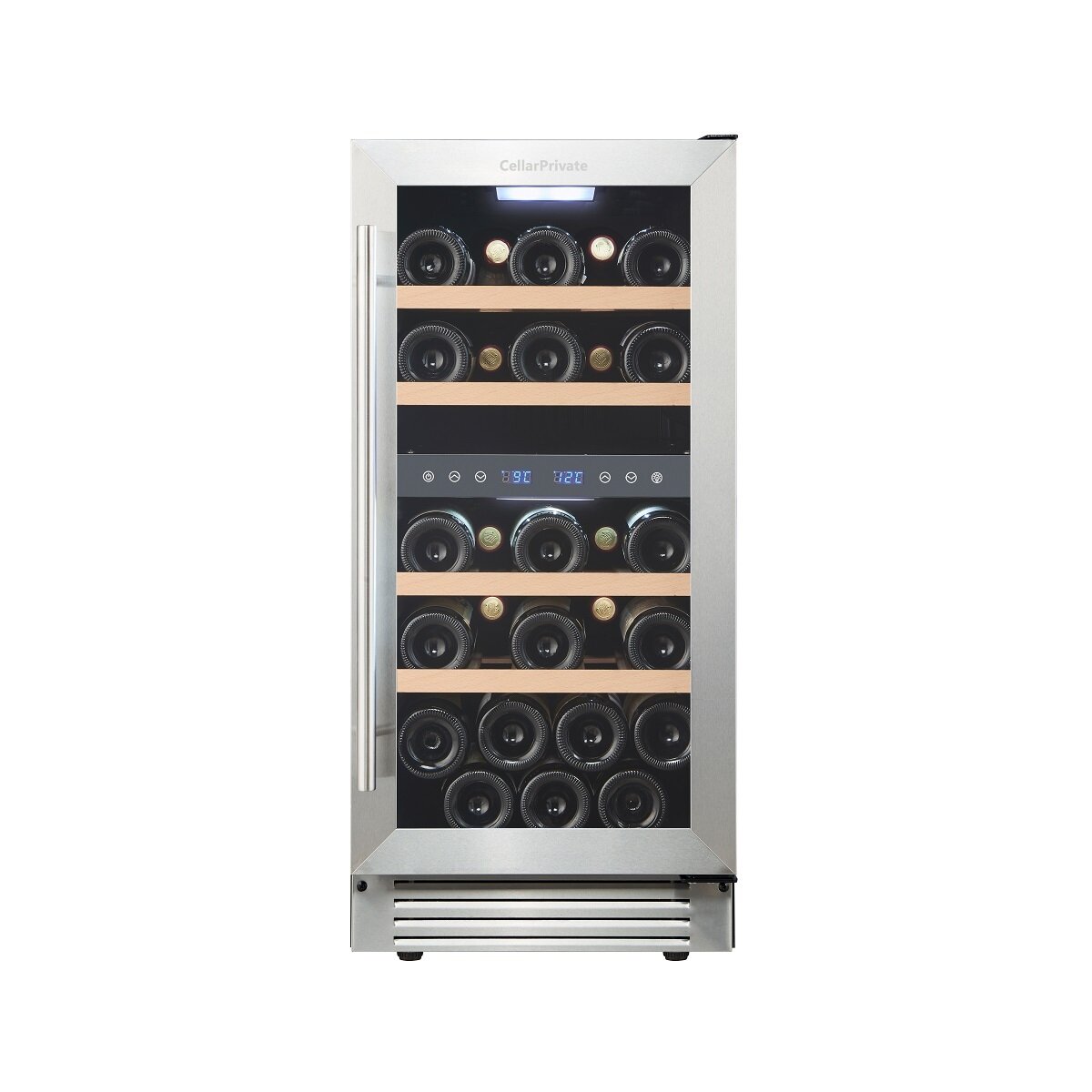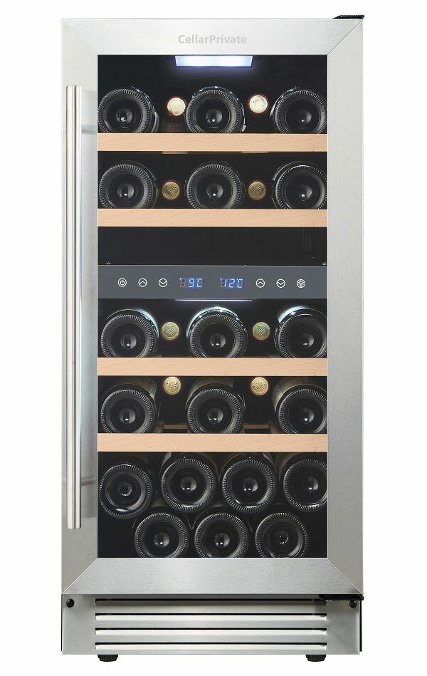 Винный шкаф Cellar Private CP027-2T, встраиваемый, двухтемпературный 27бут, серебристый.