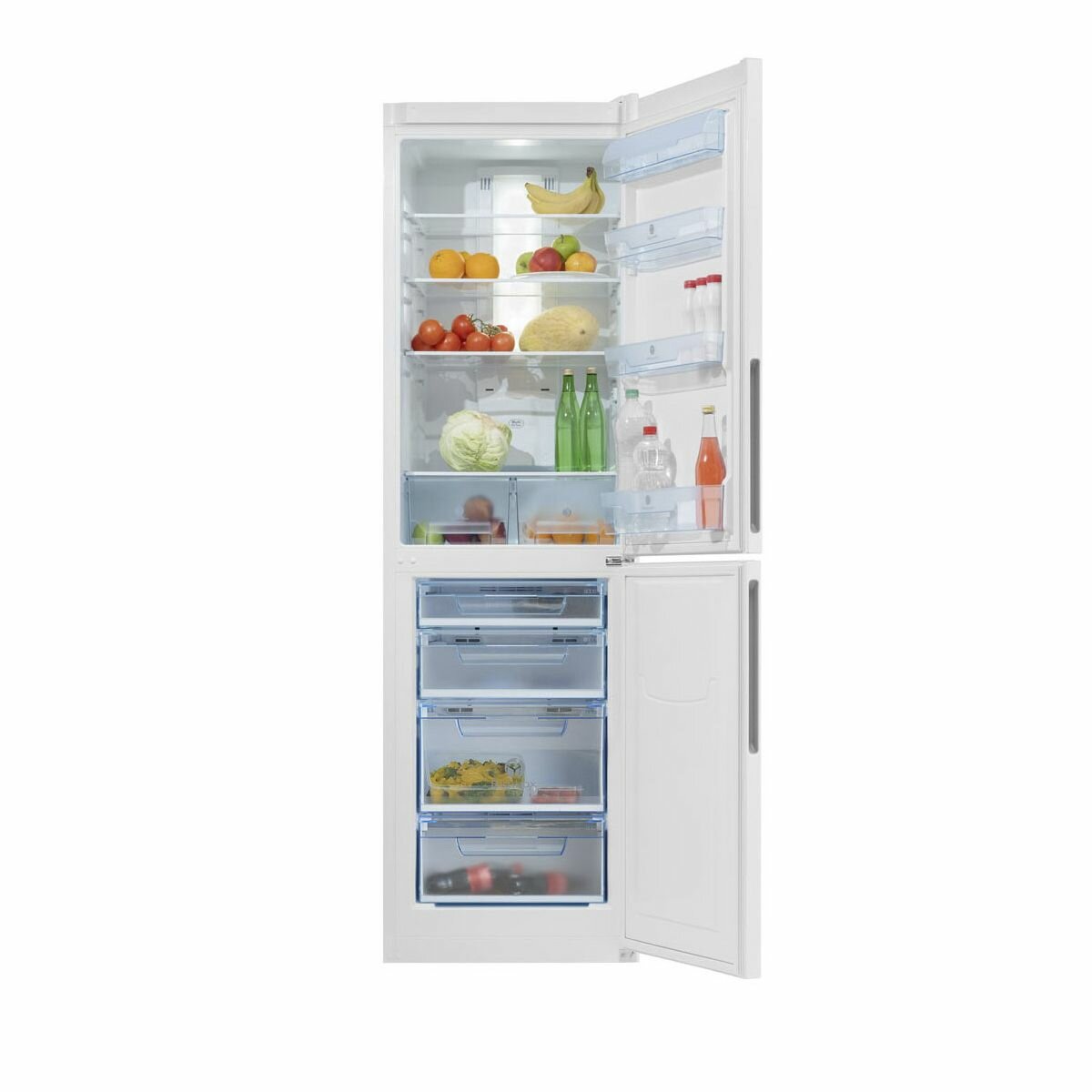 в холодильной камере полки можно варьировать по высоте. в морозильной камере четыре контейнера. хорошее решение - продукты в заморозку можно разделить на большее количество групп. взяли версию с дверями из серого металлопласта - смотрится отлично. следы от касаний незаметны. упакован надежно. все полки внутри зафиксированы от перемещений. |