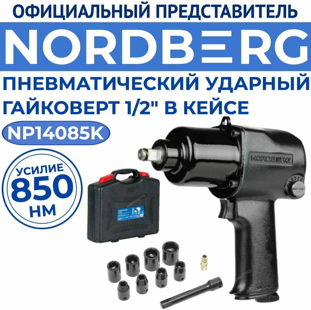 Nordberg Пневмогайковерт Np14085k ударный 1 2 , 850Нм, с головками в кейсе, ECO Np14085k .