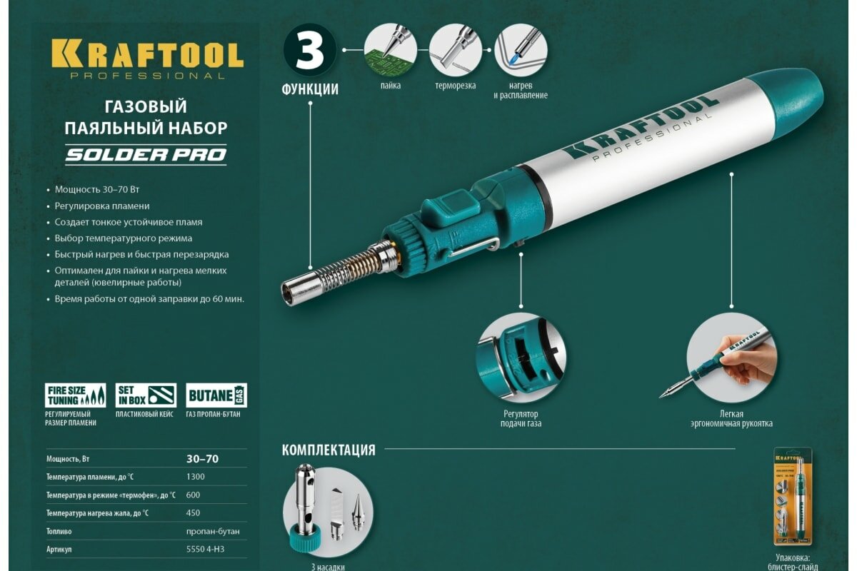 Набор 3-в-1 KRAFTOOL SolderPro газовый паяльник горелка фен 30-70Вт 1300С 70A (55504-H3)