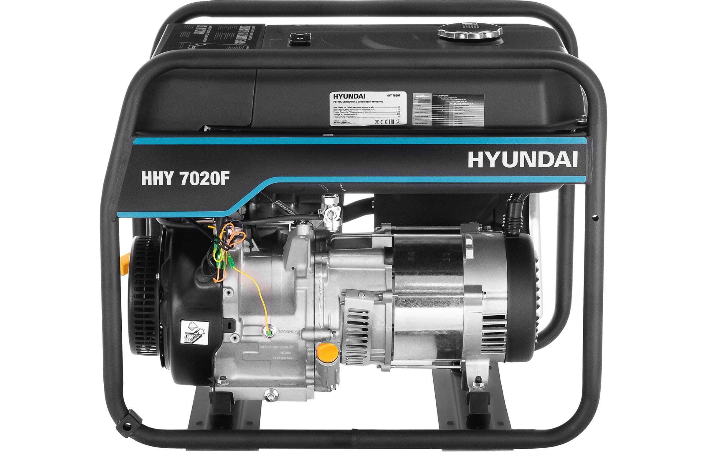 HYUNDAI [HHY 7020F] Генератор бензиновый { Запуск ручной, HYUNDAI IC390, 4-х такт, Напряжение/Частота 230В/50Гц, max 5,5 кВт/nom 5,0 кВт, Мощность/Объем дв. 13 л.с., 389 см3, Вес 72 кг }
